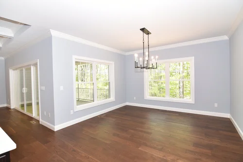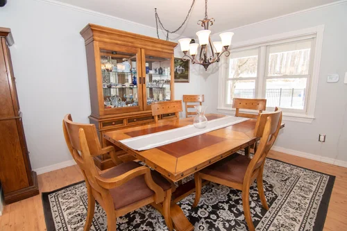 The living room is anchored by a central Heat n’ Glo gas fireplace framed by a grass cloth wallpaper surround with crisp white colonial mantle and roman style fixed windows on each side of the hearth. Above, there is a flat screen television which can transfer with sale. Large windows overlook the backyard and overhead a tray ceiling outlines the room adding extra height with recessed lighting and a ceiling fan.