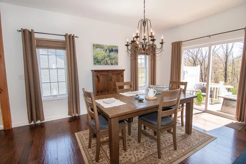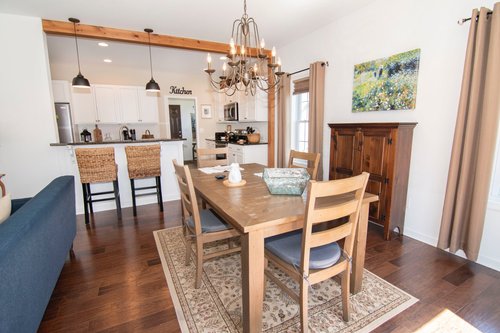 On left you’ll see French doors with a transom overhead leading to the office/den with terrific natural light from the large windows looking out to the porch. The dining room offers the space for a formal table with hutch and sideboard but maintains its open feel with just two craftsman style posts defining it from the remaining living area. A modern linear chandelier lights up the space.