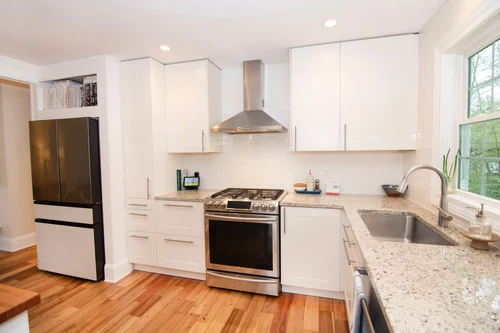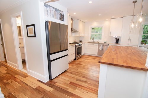 FIRST FLOOR: Entering the foyer you’ll appreciate the privacy of a solid door but also the natural light provided by the transom window above it. There’s a custom wallpaper accent wall and a coat closet at the ready. Wide plank engineered hardwoods begin here and run throughout the living space.